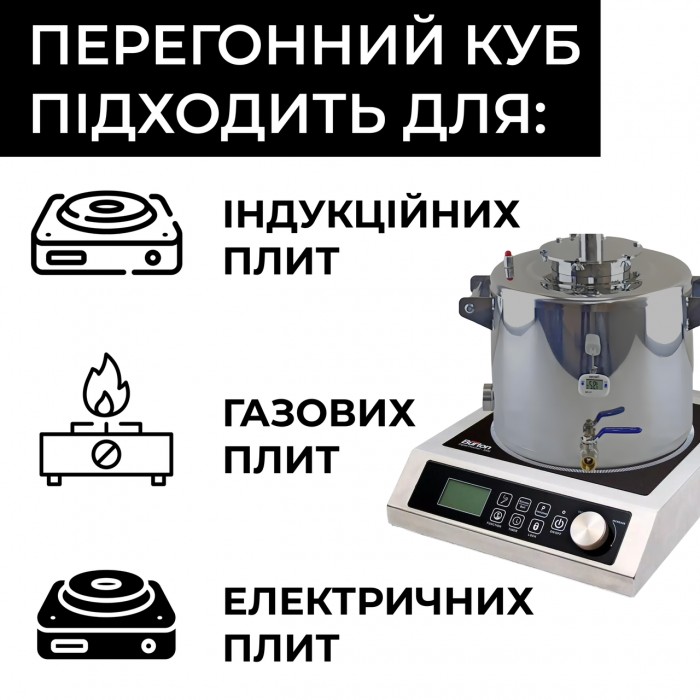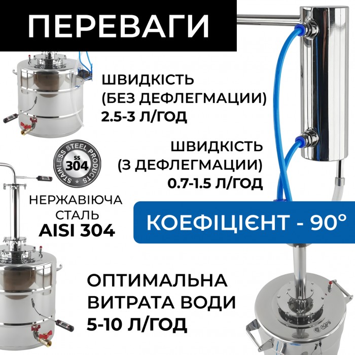 - Перегінний куб 20 л з посиленим штампованим дном, виносною горловиною та клапаном безпеки.