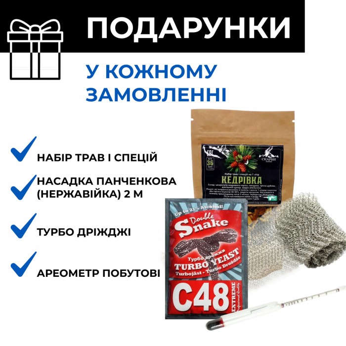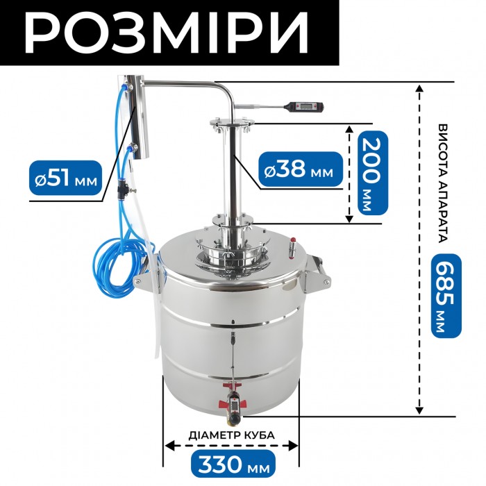 - Перегінний куб 27 л з посиленим штампованим дном, виносною горловиною та клапаном безпеки.