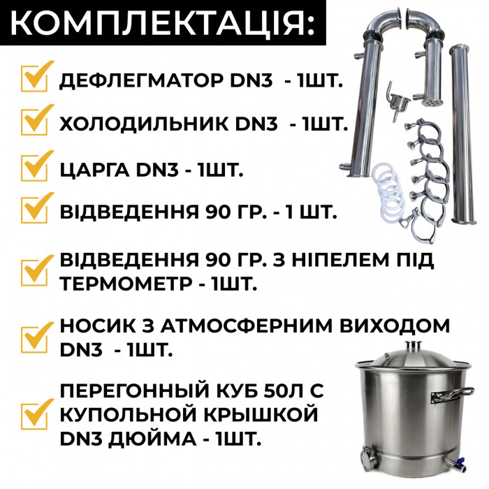 Дистилятор апарат Brew 3 дюйми 50 л Опис: Даний апарат виготовлений із нержавіючої сталі AISI 304. Клампове з'єднання. Швидке та зручне складання та розбирання апарату. Підвищує функціональність! Знімна верхня кришка. ... Читати далі...